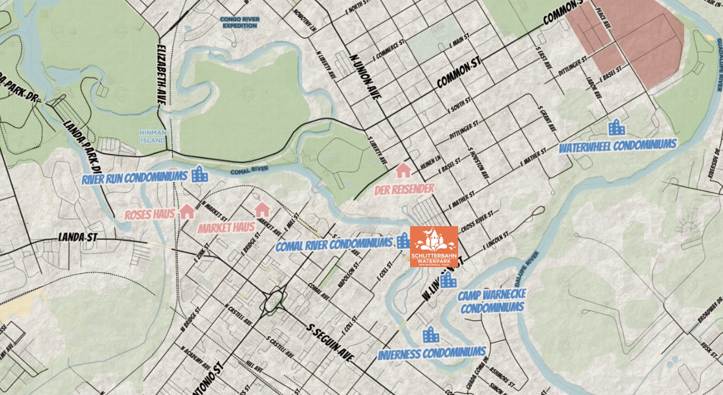 Step outside and you’re in the heart of the action: the famous Master Blaster ride is across the street and local tube outfitters are just next door with everything you need for a float trip down the Comal.