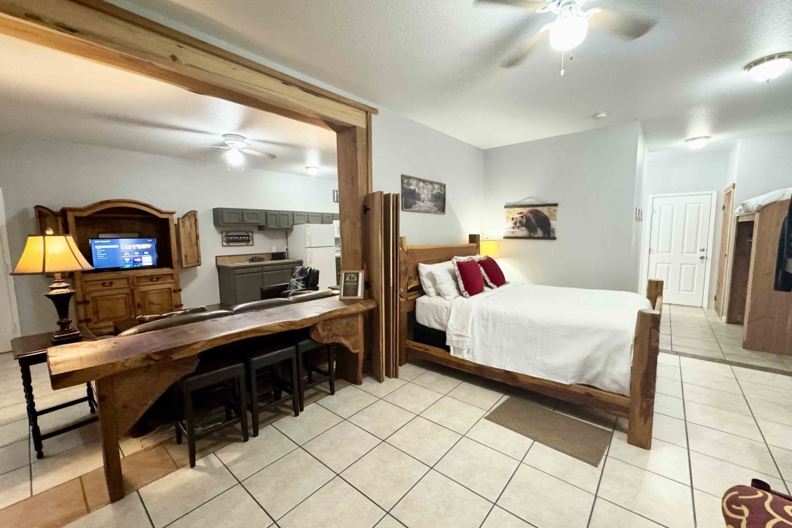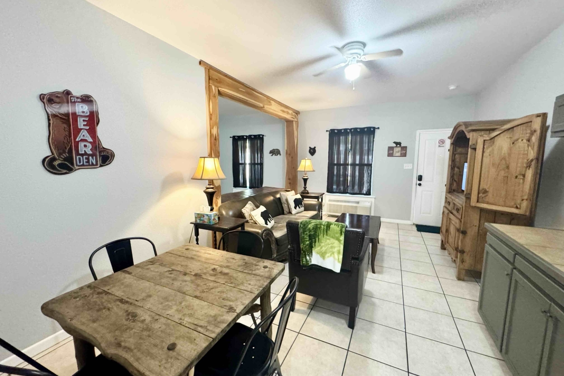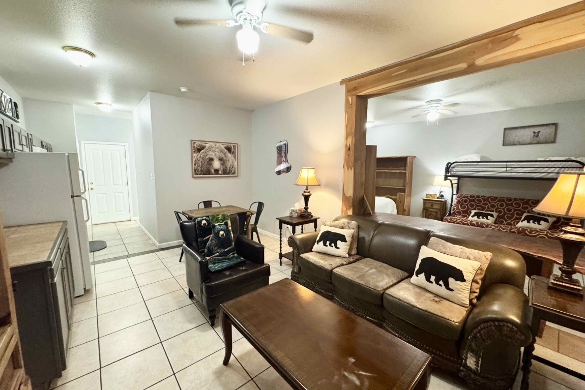 "Beware of the Bear" Wasser Lodge #102 was designed by combining two rooms into one large suite, this inviting space features a queen bed, a fun bunk setup with a twin on top and a full futon below, plus 1.5 bathrooms to keep everyone comfortable.